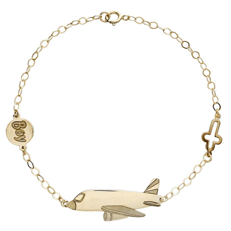 Παιδική ταυτότητα από χρυσό Κ9 με σταυρουδάκι, αεροπλάνο και χαραγμένο “Boy”