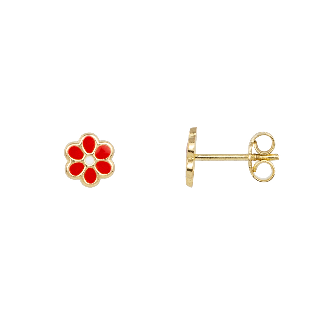 Καρφωτά παιδικά σκουλαρίκια από χρυσό 9Κ με σχέδιο κόκκινη μαργαρίτα