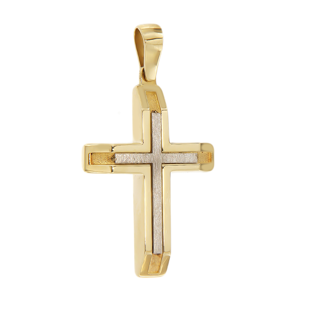 Δίχρωμος χρυσός σταυρός Κ14 διακοσμημένος με λουστρέ και ματ επιφάνειες
