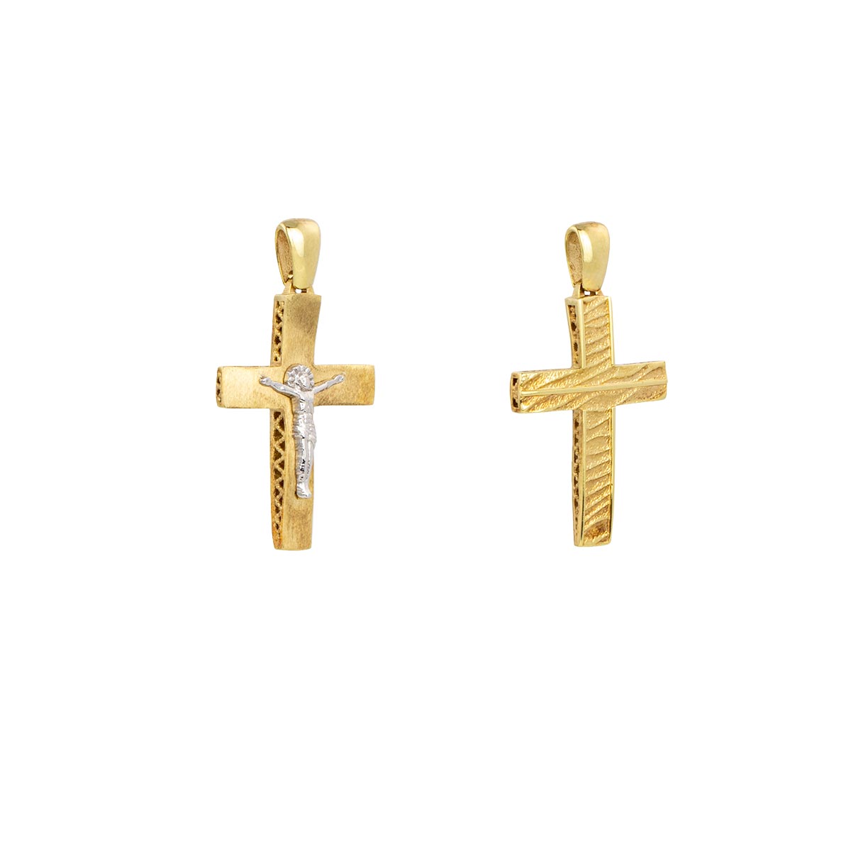 Δίχρωμος χρυσός σταυρός Κ14 διπλής όψης διακοσμημένος με τον Εσταυρωμένο