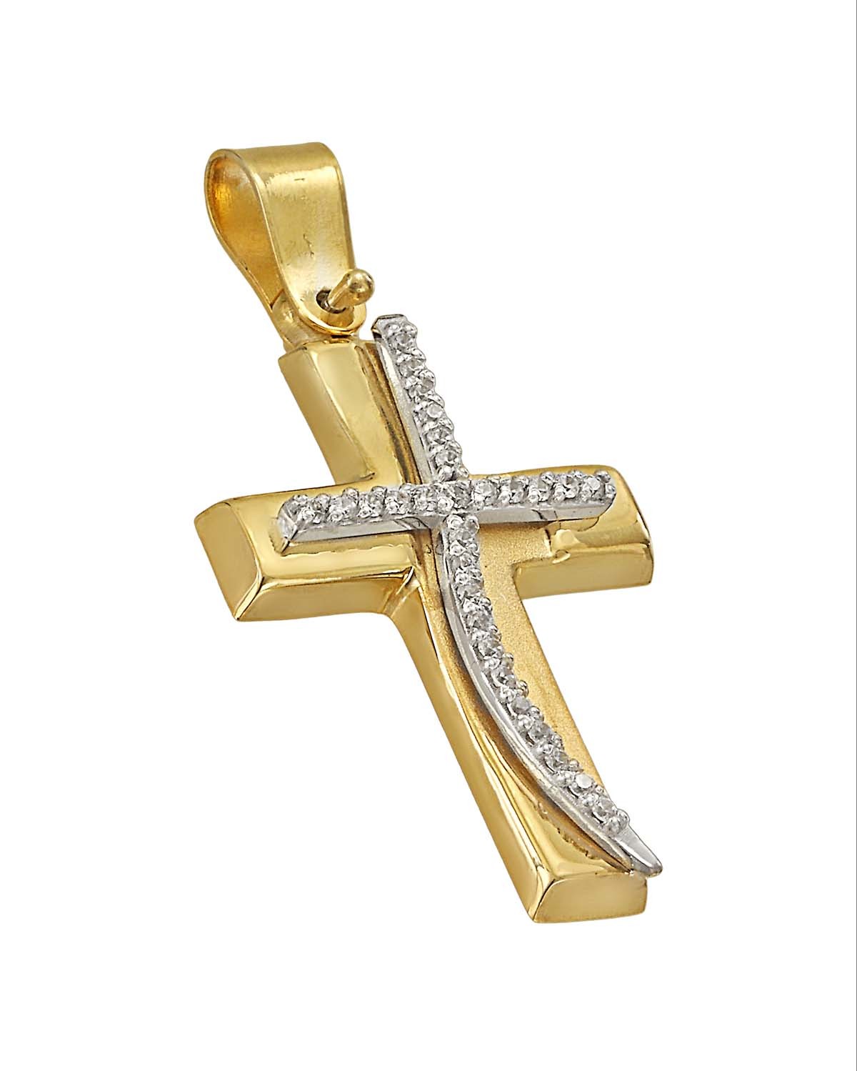 Χρυσός λουστρέ σταυρός Κ14 διακοσμημένος με λευκά ζιργκόν σε σχέδιο καμπύλης