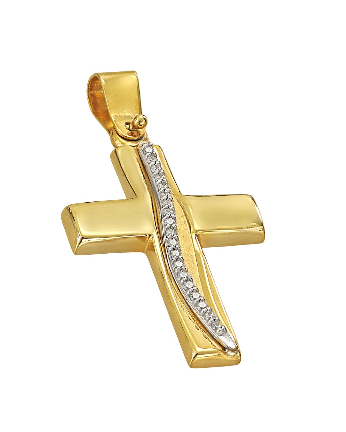 Χρυσός λουστρέ σταυρός Κ14 διακοσμημένος με λευκά ζιργκόν σε σχέδιο καμπύλης