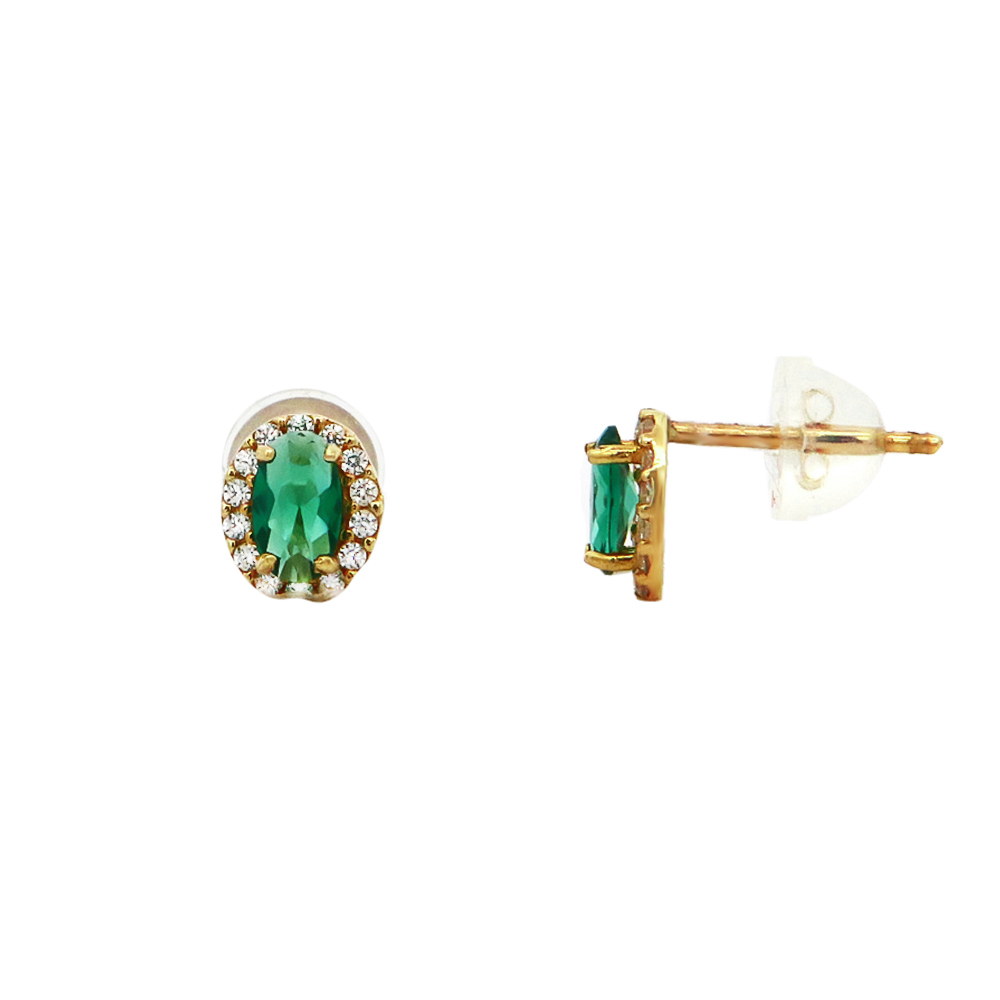 Καρφωτά χρυσά 14Κ σκουλαρίκια ροζέτα με πράσινη συνθετική πέτρα και λευκά ζιργκόν