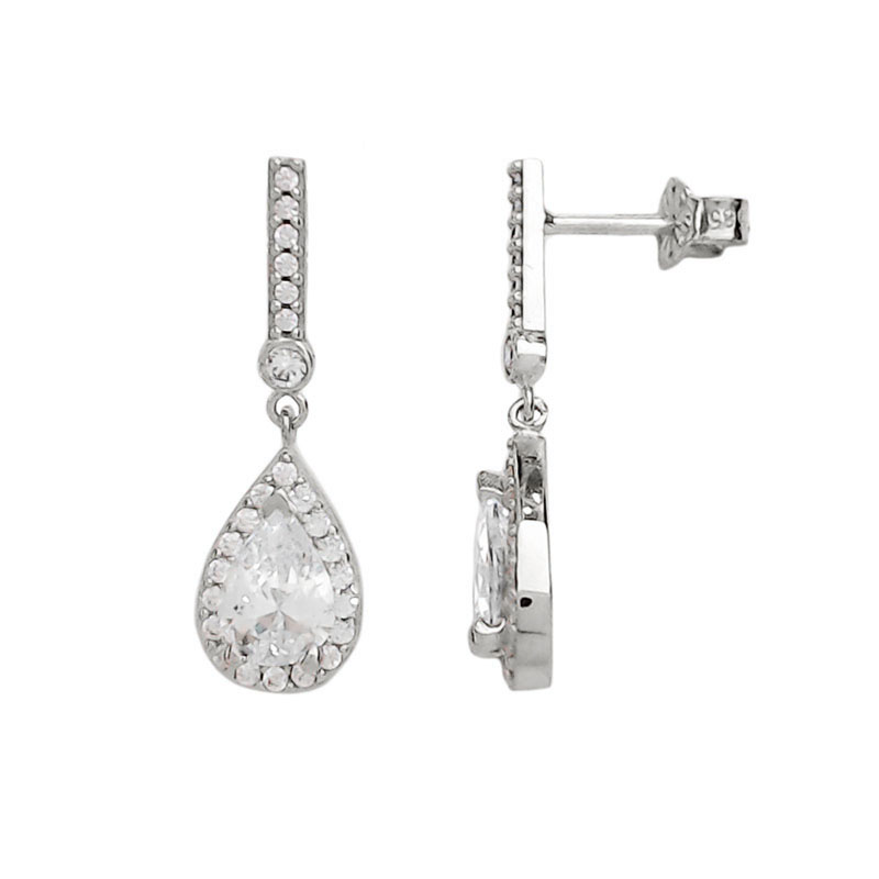 Κρεμαστά – καρφωτά λευκόχρυσα 14Κ σκουλαρίκια ροζέτα σε σχήμα δάκρυ και μπάρα με λευκά ζιργκόν