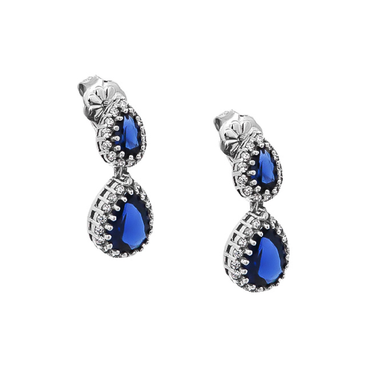 Κρεμαστά – καρφωτά λευκόχρυσα 14Κ σκουλαρίκια, με μπλε ροζέτα σε σχήμα διπλό δάκρυ