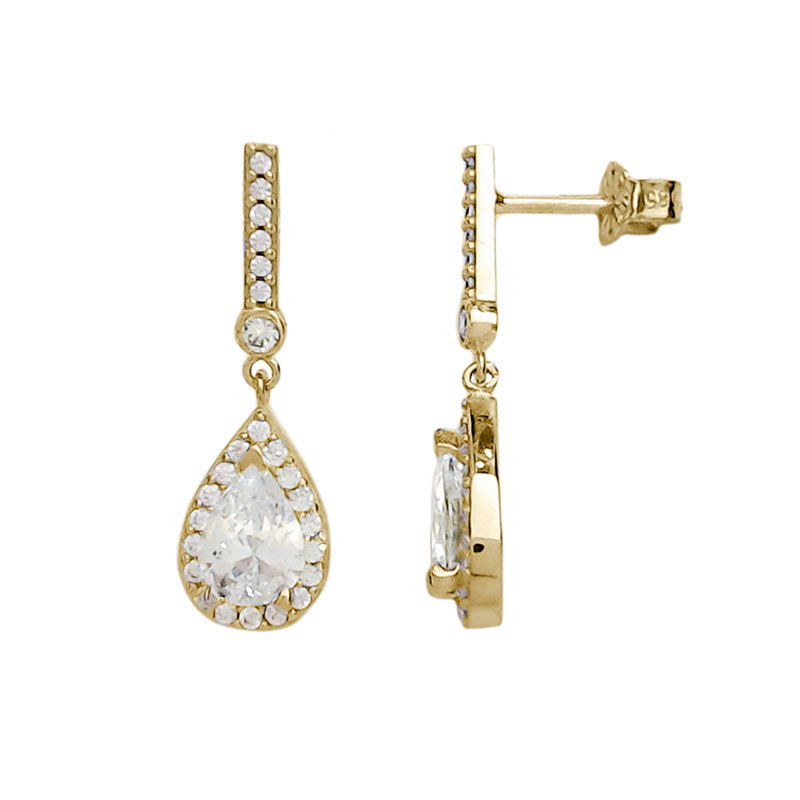 Κρεμαστά – καρφωτά χρυσά 14Κ σκουλαρίκια ροζέτα σε σχήμα δάκρυ και μπάρα με λευκά ζιργκόν