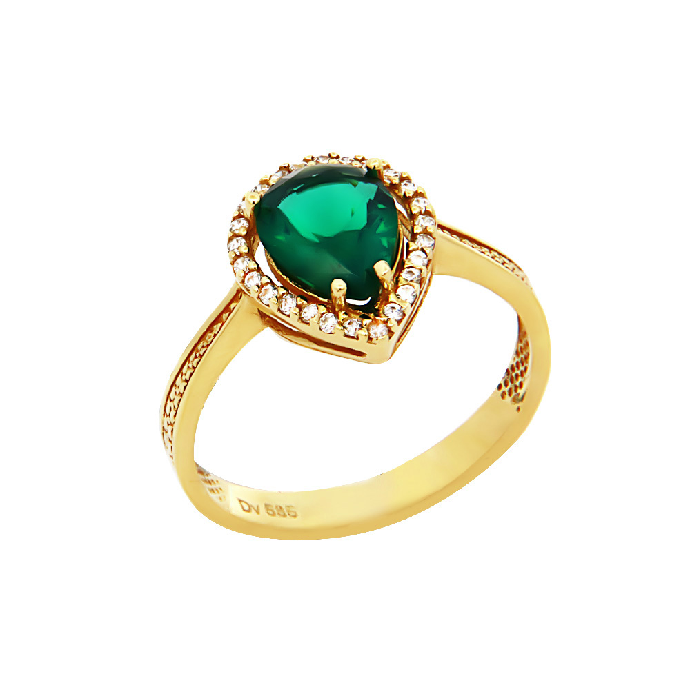 Χρυσό δαχτυλίδι Κ14 ροζέτα δάκρυ, με πράσινη κεντρική πέτρα και λευκά ζιργκόν