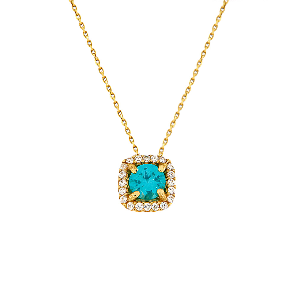 Χρυσό κολιέ Κ14 με τετράγωνη ροζέτα με γαλαζοπράσινη πέτρα και λευκά ζιργκόν