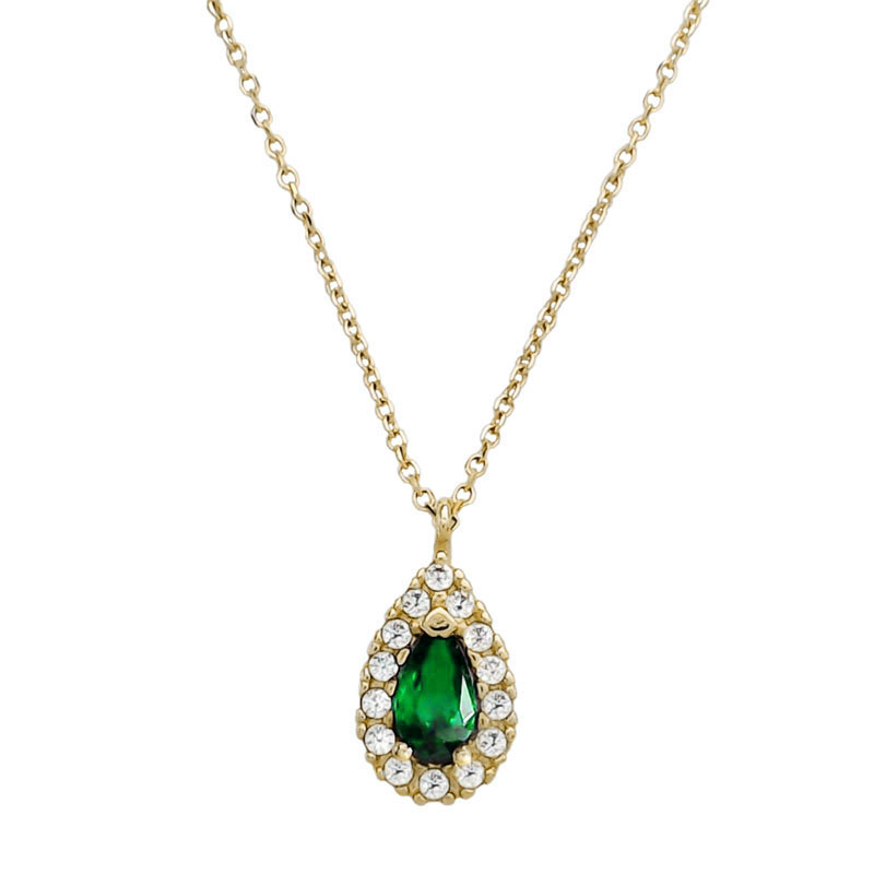 Χρυσό κολιέ Κ14 ροζέτα σε σχήμα δάκρυ, με πράσινο και λευκά ζιργκόν