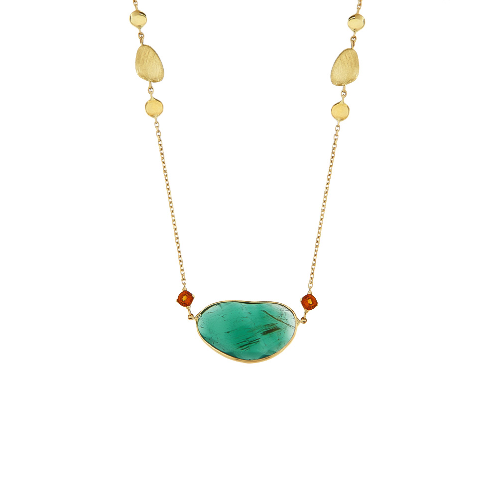 Χρυσό μοντέρνο κολιέ Κ14 με πράσινη πέτρα και δύο σιτρίν