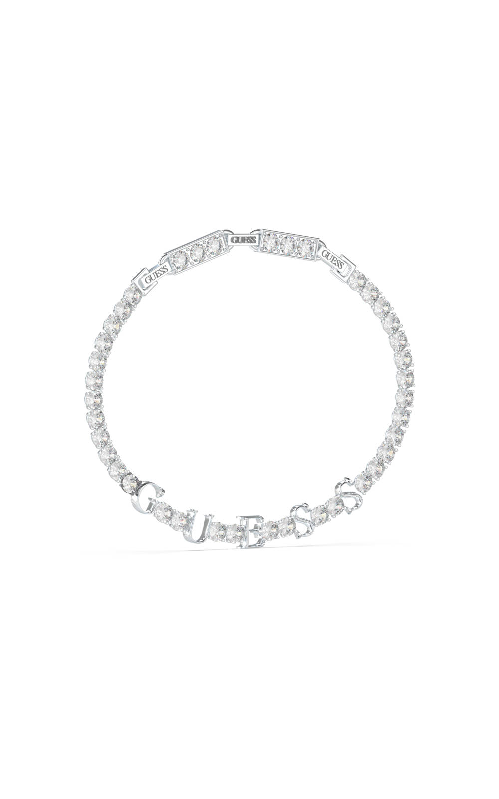 Γυναικείο βραχιόλι GUESS STEEL ασημένιου χρώματος. Έχει σχέδιο το λογότυπο της εταιρείας και είναι διακοσμημένο με διαφανείς πέτρες ζιργκόν(21cm).