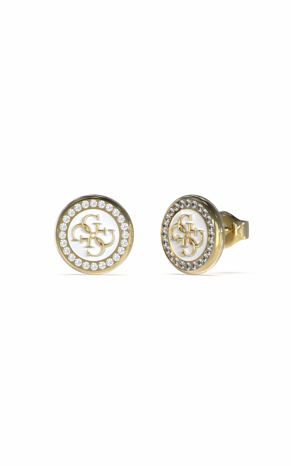 Γυναικεία σκουλαρίκια GUESS STEEL χρυσού και λευκού χρώματος. Είναι στρογγυλά, με πέτρες ζιργκόν και λογότυπο της εταιρείας(1,2cm).