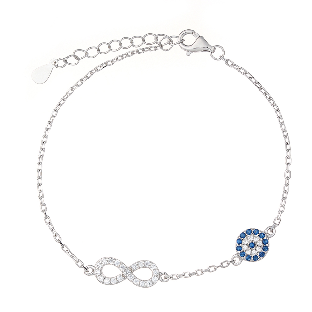Ασημένιο βραχιόλι με άπειρο και ματάκι διακοσμημένο με λευκά και μπλε ζιργκόν